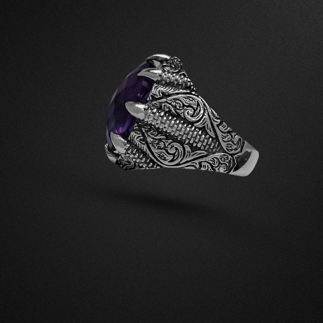 انگشتر مردانه بسیار شیک با طرح رکاب چنگال اژدها و نگینِ خوش رنگ و خوش تراش آمیتیست! گوهر به کار رفته در این انگشتر کاملا طبیعی و معدنی میباشد و همچنین تراش آن تراشی خاص معروف به فنسی کات است که به دقیق ترین شکل ممکن انجام شده است و زیباییاش رو دوچندان کرده و واقعا مجذوب کننده است! همچنین جنس رکاب از نقره 925 یعنی بالاترین عیار مورد استفاده در ساخت جواهرات است که با نهایت دقت و ظرافت ساخته شده است. همچنین در مورد سایز انگشتر اصلا نگران نباشید. سایز انگشتر سایز متوسط میباشد و اگر برای انگشت شما بزرگ یا کوچک باشد در نقره فروشی ها، طلافروشی ها، جواهر فروشی ها یا تعمیرات نقره شهرتان با هزینه ناچیزی قابل سایز شدن است. انگشتر به همراه جعبه چوبی تقدیم میشود.