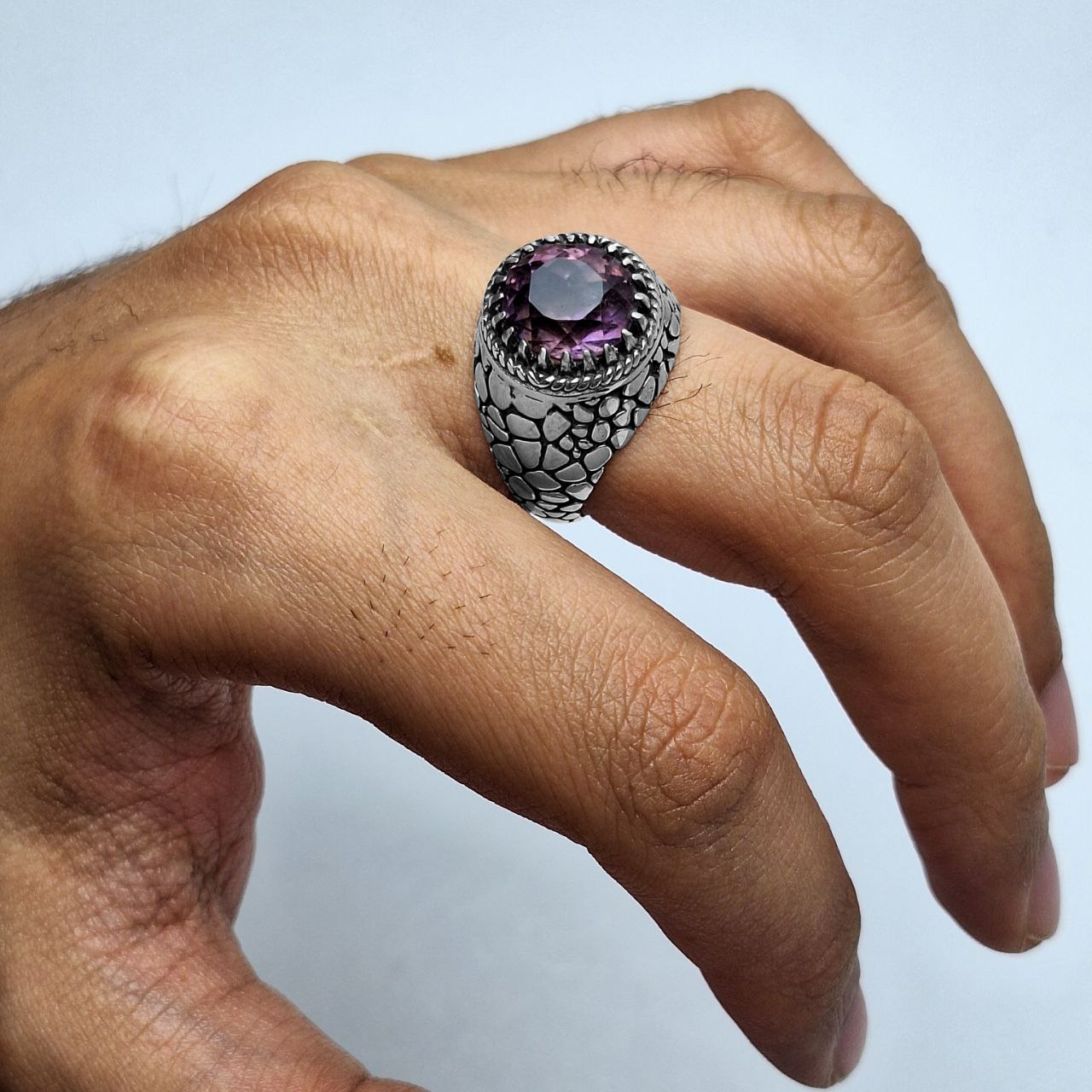 انگشتر مردانه بسیار شیک با طرح رکاب سنگفرشی و نگینِ خوش رنگ و خوش تراش آمیتیست! گوهر به کار رفته در این انگشتر کاملا طبیعی و معدنی میباشد و همچنین تراش آن تراشی بینقص است که به دقیق ترین شکل ممکن انجام شده است و زیباییاش را دوچندان کرده و واقعا مجذوب کننده است! همچنین جنس رکاب تماما از نقره 925 یعنی بالاترین عیار مورد استفاده در ساخت جواهرات است که با نهایت دقت و ظرافت ساخته شده است. همچنین در مورد سایز انگشتر اصلا نگران نباشید. سایز انگشتر سایز متوسط میباشد و اگر برای انگشت شما بزرگ یا کوچک باشد در نقره فروشی ها، طلافروشی ها، جواهر فروشی ها یا تعمیرات نقره شهرتان با هزینه ناچیزی قابل سایز شدن است. انگشتر به همراه جعبه چوبی تقدیم میشود.