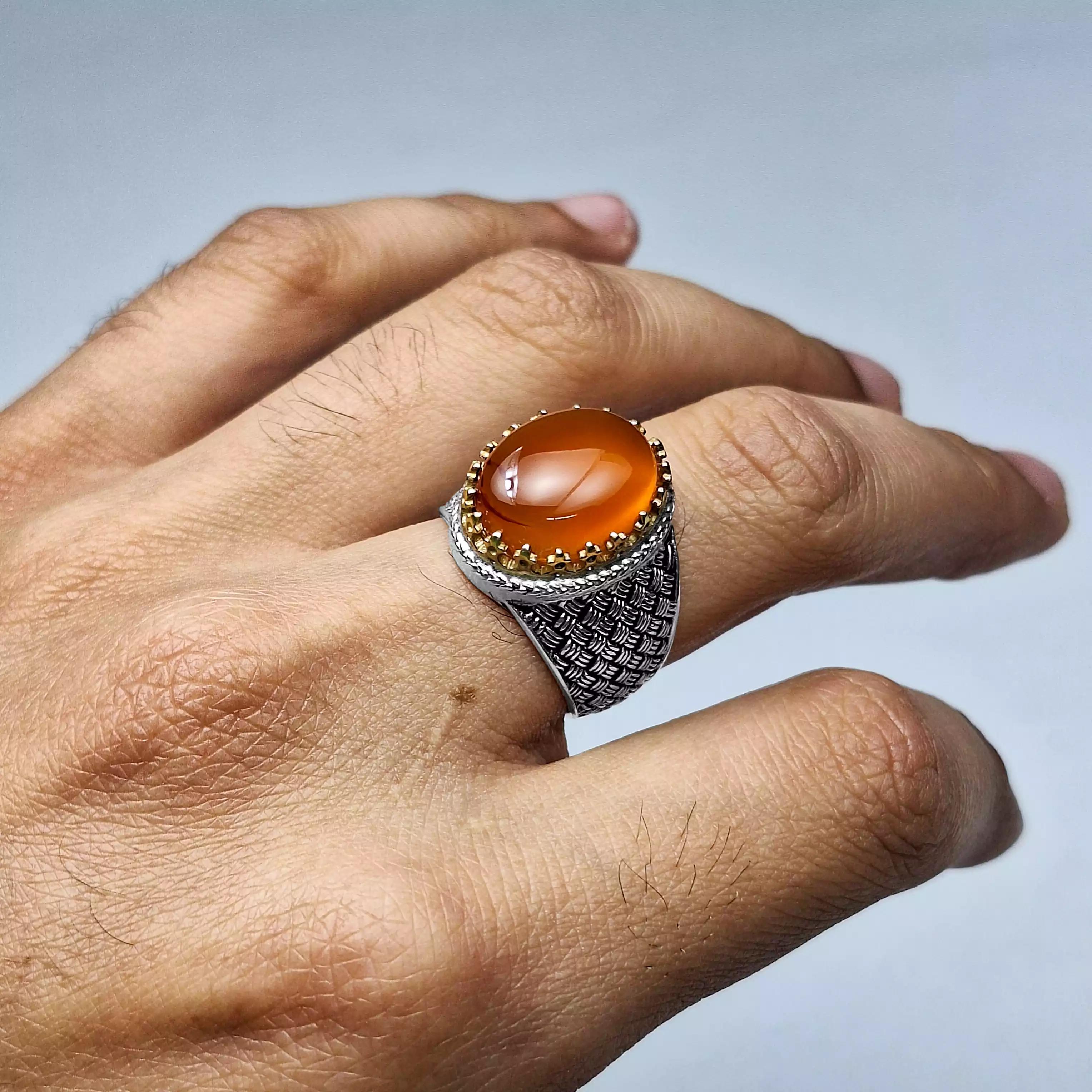 انگشتر مردانه بسیار شیک با طرح رکاب حصیربافت و نگینِ خوش آب و رنگ عقیق یمنی پرتقالی