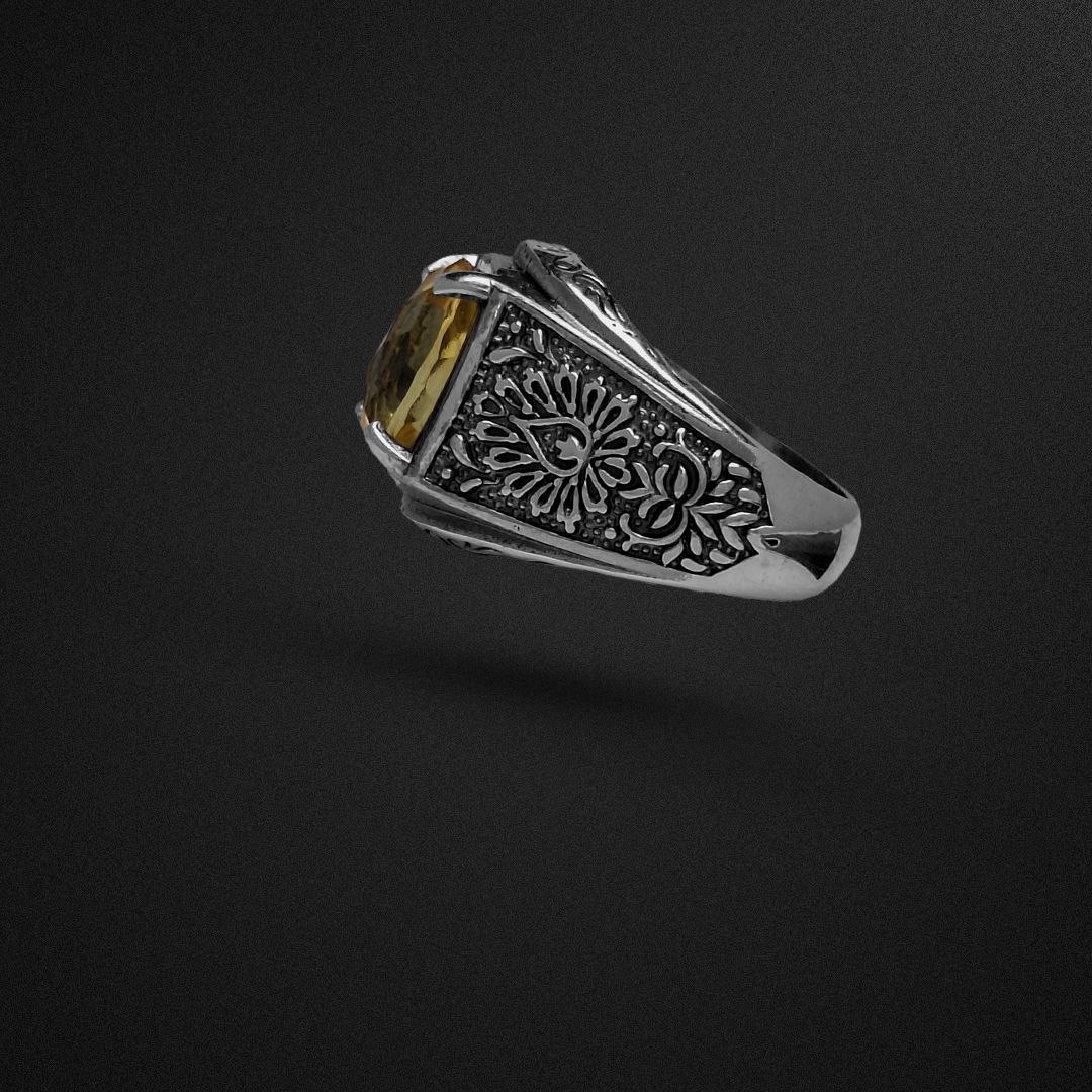 انگشتر مردانه بسیار شیک با طرح رکاب خاص و نگینِ خوش رنگ و خوش تراش سیترین! گوهر به کار رفته در این انگشتر کاملا طبیعی و معدنی میباشد و همچنین تراش آن تراشی خاص معروف به فنسی کات است که به دقیق ترین شکل ممکن انجام شده است و زیباییاش رو دوچندان کرده و واقعا مجذوب کننده است! همچنین جنس رکاب از نقره 925 یعنی بالاترین عیار مورد استفاده در ساخت جواهرات است که با نهایت دقت و ظرافت ساخته شده است. همچنین در مورد سایز انگشتر اصلا نگران نباشید. سایز انگشتر سایز متوسط میباشد و اگر برای انگشت شما بزرگ یا کوچک باشد در نقره فروشی ها، طلافروشی ها، جواهر فروشی ها یا تعمیرات نقره شهرتان با هزینه ناچیزی قابل سایز شدن است. انگشتر به همراه جعبه چوبی تقدیم میشود.