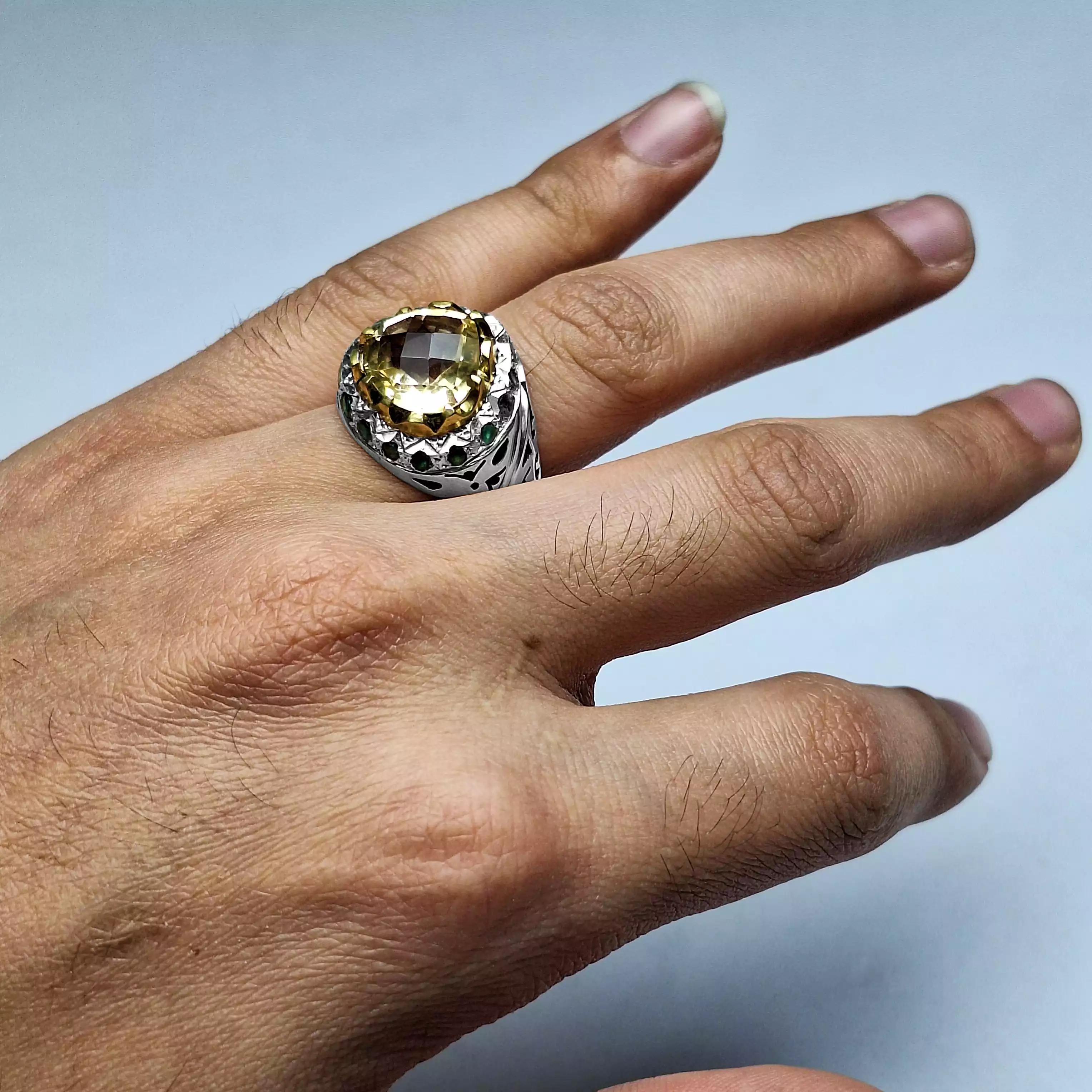انگشتر مردانه بسیار شیک با طرح رکاب خاص و نگینِ و خوش رنگ و ارزشمند سیترین گوهر به کار رفته در این انگشتر کاملا طبیعی و معدنی میباشد و همچنین تراشی بی نقص به فرم فنسی است که این موضوع زیباییاش را دوچندان کرده و واقعا مجذوب کننده است. همچنین جنس رکاب بالاترین عیار نقره مورد استفاده در ساخت جواهرات یعنی نقره 925 است که با نهایت دقت و ظرافت به دست اساتید هنرمند ساخته و سپس شبکه کاری و با زمرد های طبیعی مخراج کاری شده است. همچنین در مورد سایز انگشتر اصلا نگران نباشید. سایز انگشتر سایز متوسط میباشد و اگر برای انگشت شما بزرگ یا کوچک باشد در نقره فروشی ها، طلافروشی ها، جواهر فروشی ها یا تعمیرات نقره قابل تغییر سایز است. انگشتر به همراه جعبه چوبی به شما تقدیم میشود.