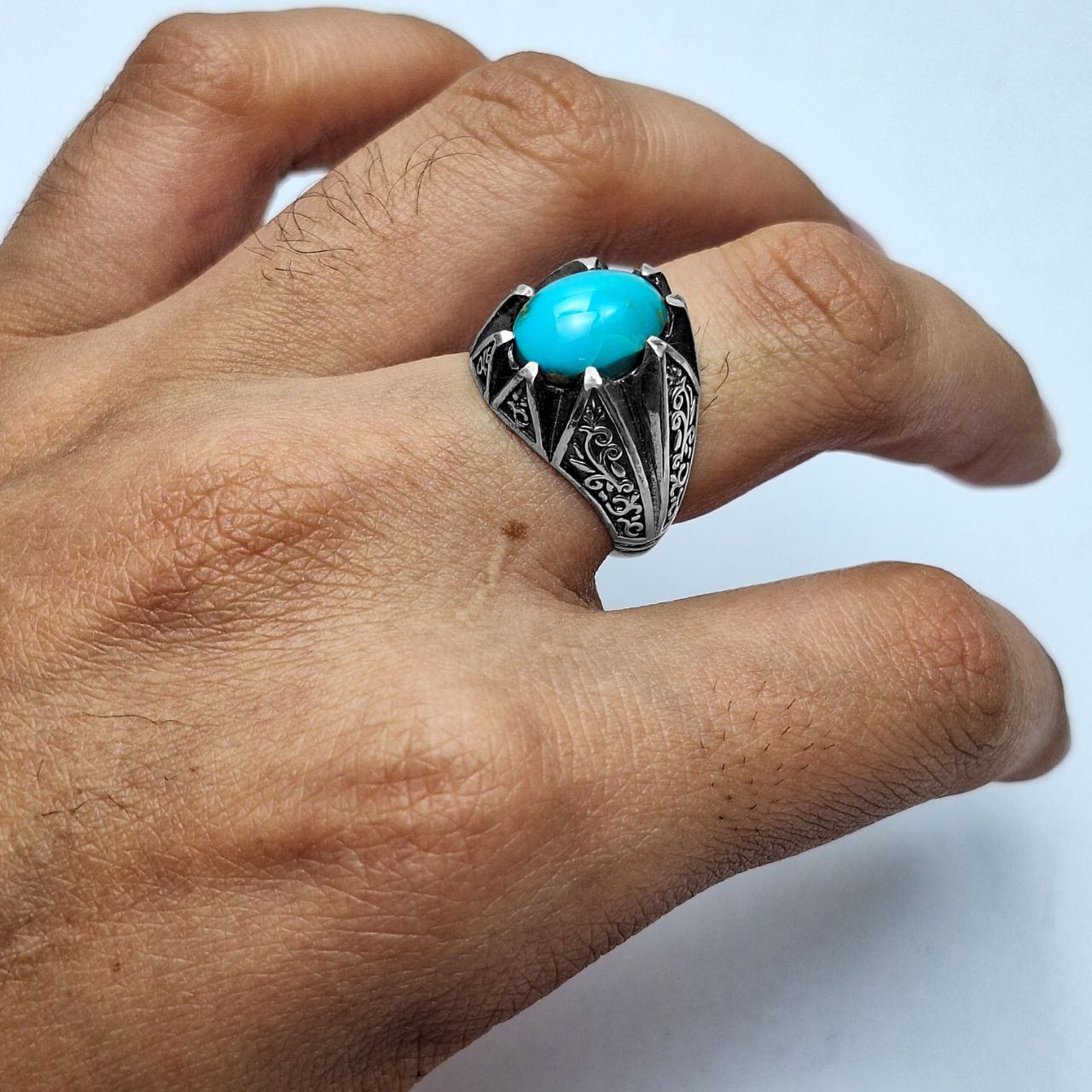 انگشتر مردانه بسیار شیک با طرح رکاب خاص و نگینِ خوش رنگ و خوش تراش فیروزه نیشابور! گوهر به کار رفته در این انگشتر کاملا طبیعی و معدنی میباشد و از معدن نیشابور استخراج شده و همچنین تراش آن تراشی بینقص است و زیباییاش را دوچندان کرده و واقعا مجذوب کننده است! همچنین جنس رکاب تماما از نقره 925 یعنی بالاترین عیار مورد استفاده در ساخت جواهرات است که با نهایت دقت و ظرافت ساخته شده است. همچنین در مورد سایز انگشتر اصلا نگران نباشید. سایز انگشتر سایز متوسط میباشد و اگر برای انگشت شما بزرگ یا کوچک باشد در نقره فروشی ها، طلافروشی ها، جواهر فروشی ها یا تعمیرات نقره شهرتان با هزینه ناچیزی قابل سایز شدن است. انگشتر به همراه جعبه چوبی تقدیم میشود.
