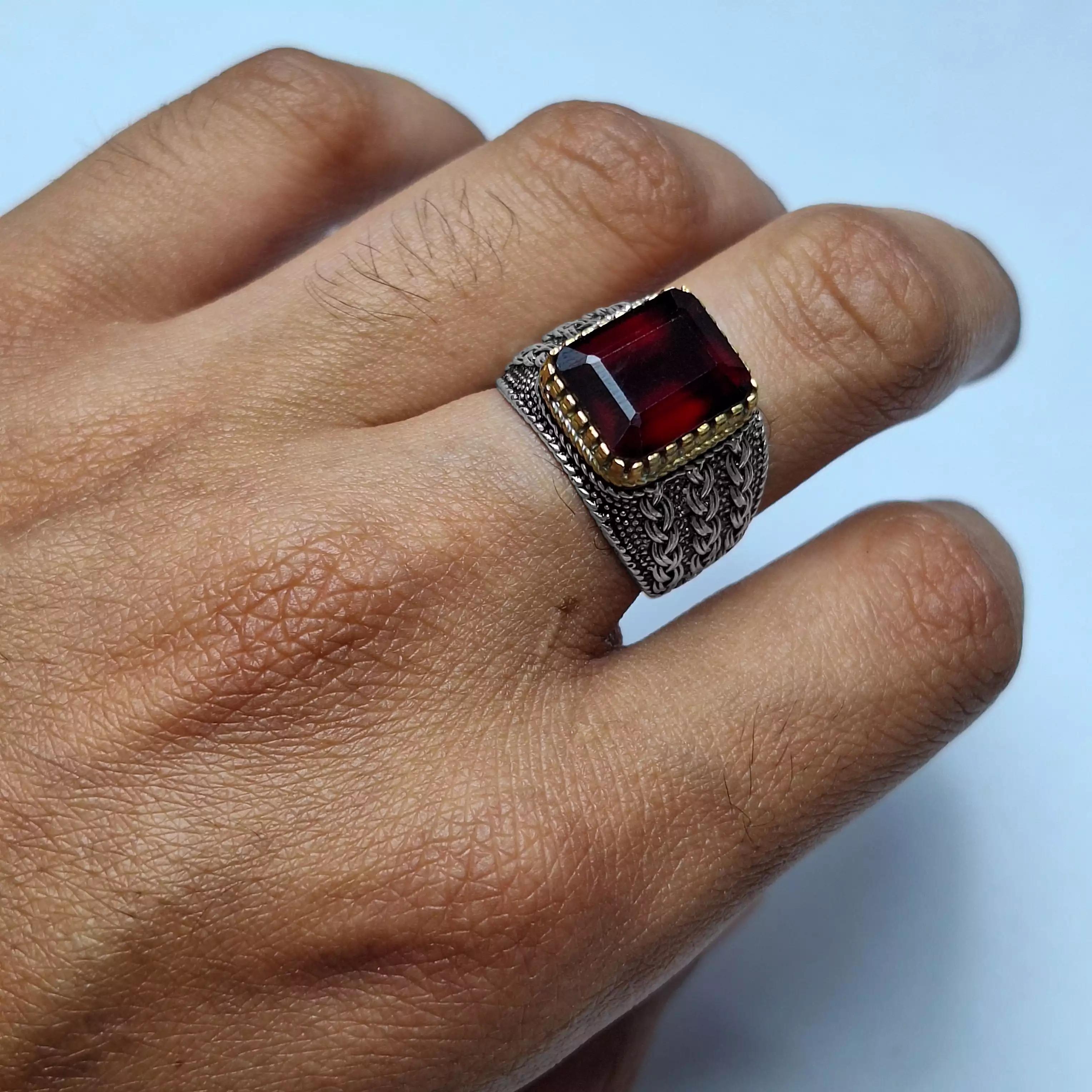 انگشتر مردانه بسیار شیک با طرح رکاب خاص و نگین مجذوب کننده گارنت سرخ گوهر ارزشمند به کار رفته در این انگشتر کاملا طبیعی و معدنی است و همچنین تراش آن تراشی خاص و کمیاب معروف به امرالد کات و همچنین بینقص است که زیباییاش را دو چندان کرده است. همچنین جنس رکاب از نقره 925 یعنی بالاترین عیار مورد استفاده در ساخت جواهرات است. در مورد سایز انگشتر اصلا نگران نباشید سایز انگشتر سایز متوسط میباشد و اگر برای انگشت شما بزرگ یا کوچک باشد در نقره فروشی ها، طلافروشی ها، جواهر فروشی ها یا تعمیرات نقره شهرتان با هزینه ناچیزی قابل تغییر سایز است. انگشتر همراه با جعبه چوبی تقدیمتان میشود.