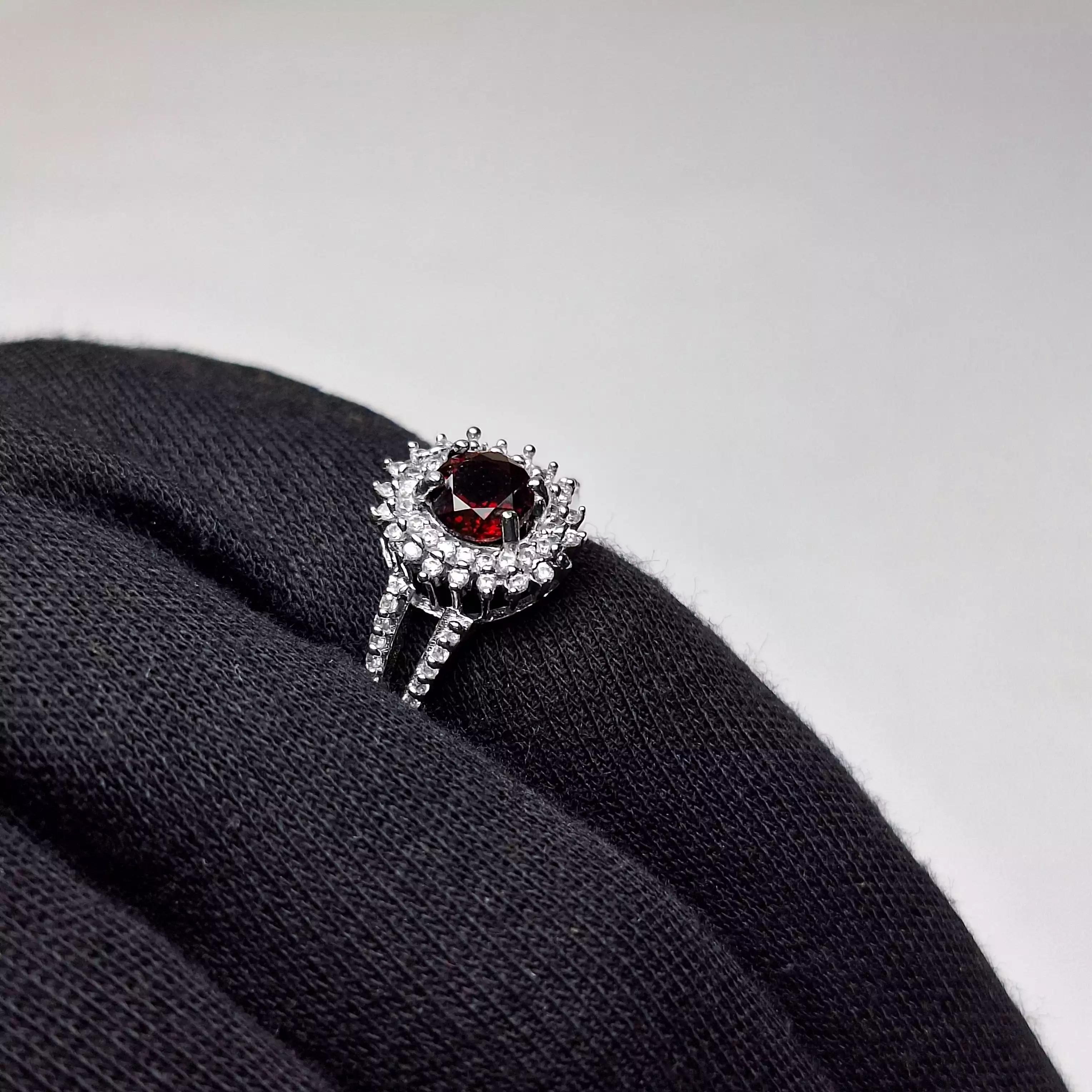 انگشتر زنانه بسیار شیک با نگینِ مجذوب کننده گارنت رودولایت گوهر ارزشمند به کار رفته در این انگشتر کاملا طبیعی و معدنی بوده و رودولایت یعنی یکی از ارزشمند ترین خانواده های گارنت طبیعی میباشد. همچنین تراش آن تراشی بی نقص است که زیباییاش را دوچندان کرده! جنس رکاب از نقره ۹۲۵ یعنی بالاترین عیار مورد استفاده در ساخت جواهرات است که آبکاری رادیوم شده است و با نگین های ریز برلیان کات مخراج کاری شده. در مورد سایز انگشتر اصلا نگران نباشید سایز انگشتر سایز متوسط میباشد و اگر برای انگشت شما بزرگ یا کوچک باشد در نقره فروشی ها، طلافروشی ها، جواهر فروشی ها یا تعمیرات نقره شهرتان با هزینه ناچیزی قابل تغییر سایز است. انگشتر به همراه جعبه چوبی تقدیمتان میشود.