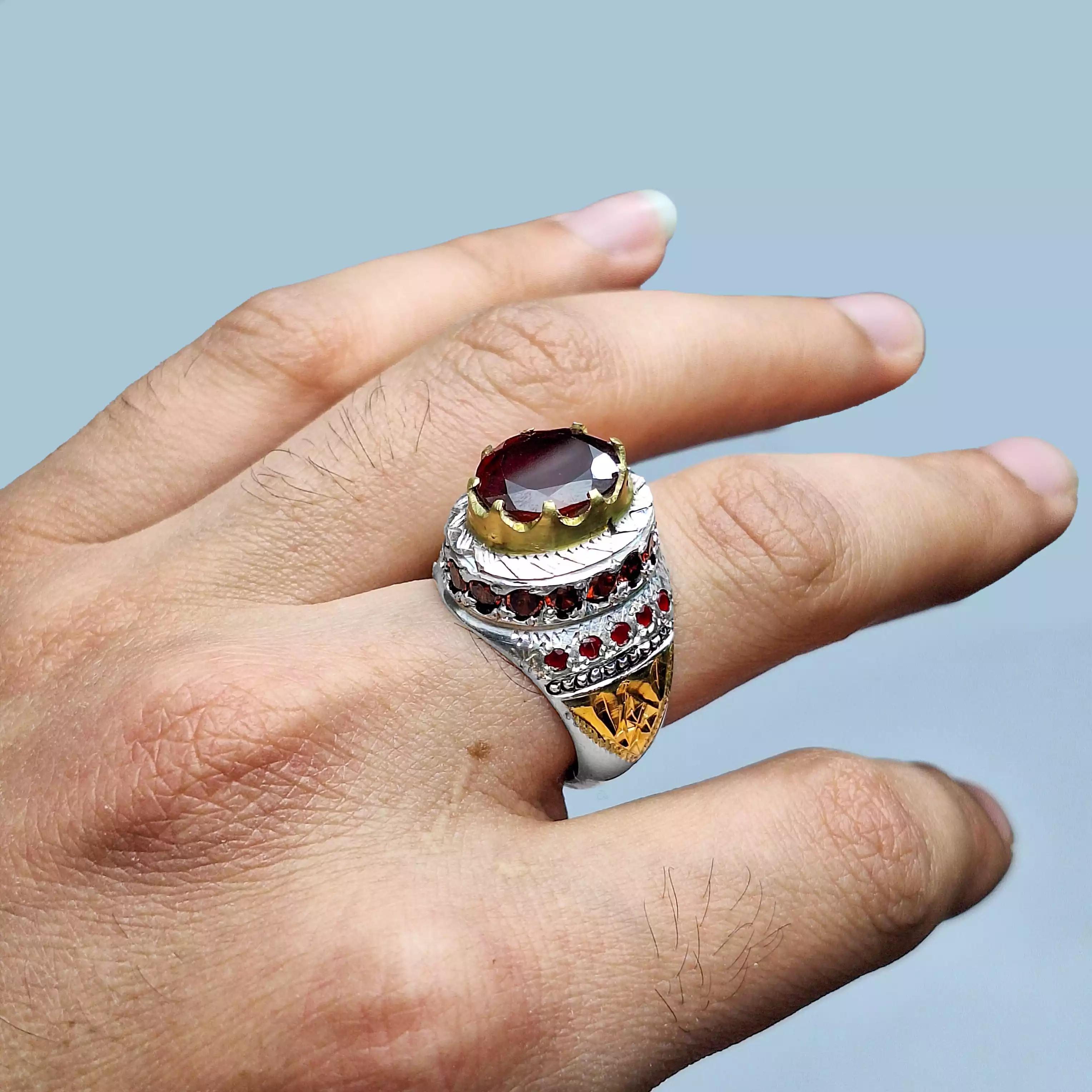 انگشتر مردانه بسیار شیک با رکاب پرکار و نگینِ ارزشمند گارنت سرخ گوهر به کار رفته در این انگشتر کاملا طبیعی و معدنیست و همچنین تراش آن تراشی بی نقص است که این موضوع زیباییاش را دوچندان کرده و واقعا مجذوب کننده است. همچنین جنس رکاب بالاترین عیار نقره مورد استفاده در ساخت جواهرات یعنی نقره 925 است که با نهایت دقت و ظرافت به دست اساتید هنرمند ساخته شده و سپس با نگین های کوپک مخراج کاری، آینه کاری و آبکاری طلا شده است. همچنین در مورد سایز انگشتر اصلا نگران نباشید. سایز انگشتر سایز متوسط میباشد و اگر برای انگشت شما بزرگ یا کوچک باشد در نقره فروشی ها، طلافروشی ها، جواهر فروشی ها یا تعمیرات نقره قابل تغییر سایز است. انگشتر به همراه جعبه چوبی به شما تقدیم میشود.