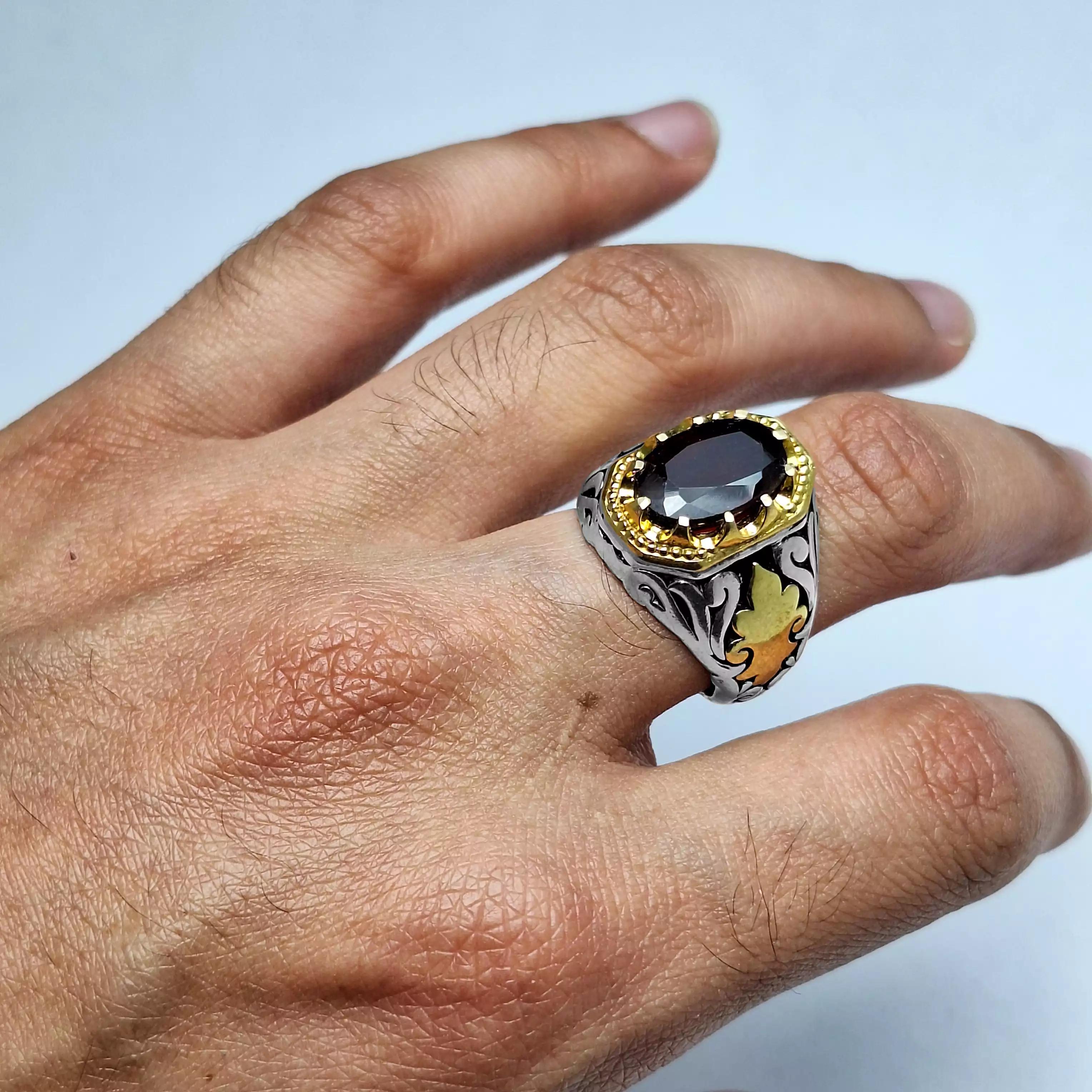 انگشتر مردانه بسیار شیک با طرح رکاب خاص و نگینِ مجذوب کننده گارنت سرخ گوهر ارزشمند به کار رفته در این انگشتر کاملا طبیعی و معدنی بوده و همچنین تراش آن تراشی بی نقص است که زیبایی‌اش را دوچندان کرده! جنس رکاب از نقره ۹۲۵ یعنی بالاترین عیار مورد استفاده در ساخت جواهرات است. در مورد سایز انگشتر اصلا نگران نباشید سایز انگشتر سایز متوسط می‌باشد و اگر برای انگشت شما بزرگ یا کوچک باشد در نقره فروشی ها، طلافروشی ها، جواهر فروشی ها یا تعمیرات نقره شهرتان با هزینه ناچیزی قابل تغییر سایز است. انگشتر همراه با جعبه چوبی تقدیمتان می‌شود.