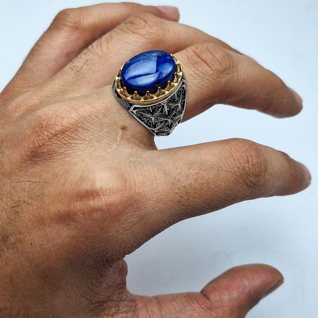 انگشتر مردانه بسیار شیک با طرح رکاب دانهبرفی و نگینِ خوش رنگ و خوش تراش لاجورد! گوهر به کار رفته در این انگشتر کاملا طبیعی و معدنی میباشد که از معادن کشور افغانستان استخراج شده و همچنین تراش آن تراشی بینقص است و زیباییاش را دوچندان کرده و واقعا مجذوب کننده است! همچنین جنس رکاب تماما از نقره 925 یعنی بالاترین عیار مورد استفاده در ساخت جواهرات است که با نهایت دقت و ظرافت ساخته شده است. همچنین در مورد سایز انگشتر اصلا نگران نباشید. سایز انگشتر سایز متوسط میباشد و اگر برای انگشت شما بزرگ یا کوچک باشد در نقره فروشی ها، طلافروشی ها، جواهر فروشی ها یا تعمیرات نقره شهرتان با هزینه ناچیزی قابل سایز شدن است. انگشتر به همراه جعبه چوبی تقدیم میشود.