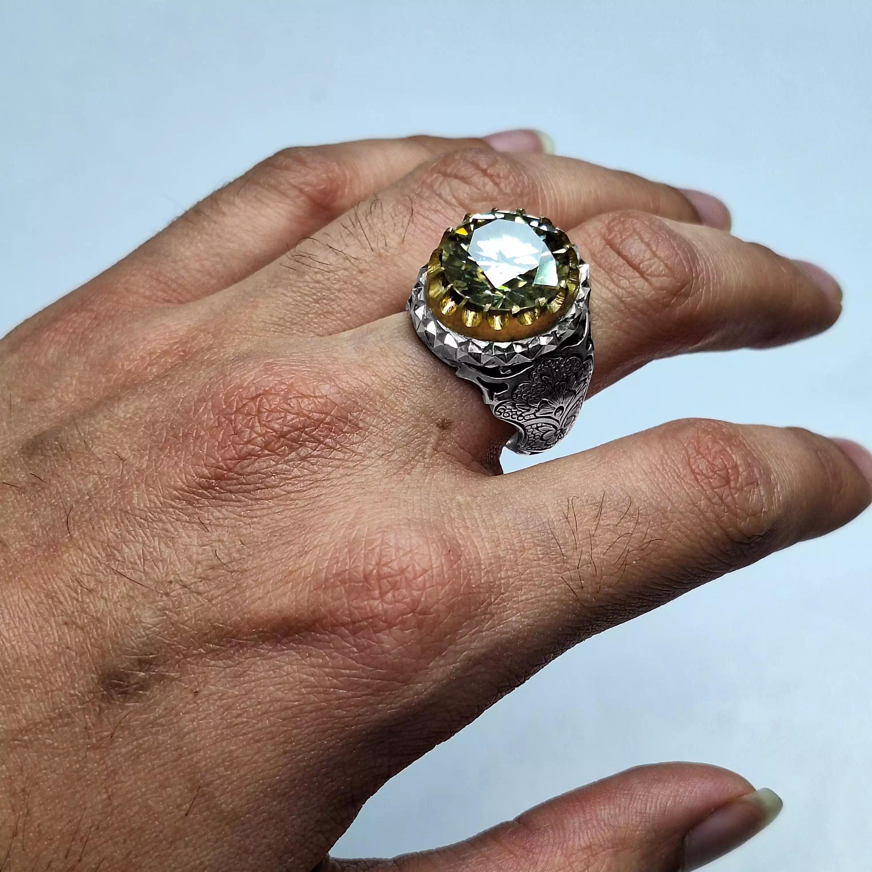 انگشتر مردانه شیک و زیبا با نگینِ خاص و پر تلالو الماس روسی گوهر به کار رفته در این انگشتر الماس روسی یا همان موزانایت میباشد. این گوهر در بین تمام گوهر های مصنوعی و طبیعی بیشتر درخشندگی و بازتاب نور را دارد؛ به شکلی که عکاسی از آن را سخت کرده، همچنین بعد از الماس طبیعی، این گوهر دومین ماده سخت جهان با سختی ۹/۲۵ موهس میباشد. تراش این نگین لیزر کات است؛ یعنی با لیزر به دقیق ترین شکل ممکن تراش داده شده است که زیباییاش را دوچندان کرده و واقعا مجذوب کننده است. رنگ این موزانایت شامپاینی (طلایی) است و پاک ترین و با کیفیت ترین موزانایت داخل بازار است. همچنین جنس رکاب از نقره ۹۲۵ و با نهایت دقت و ظرافت به دست اساتید هنرمند ساخته و سپس شبکه کاری و قلمزنی شده است. در مورد سایز انگشتر اصلا نگران نباشید. سایز انگشتر سایز متوسط میباشد و اگر برای انگشت شما بزرگ یا کوچک باشد در نقره فروشی ها، طلافروشی ها، جواهر فروشی ها یا تعمیرات نقره شهرتان با هزینه ناچیزی قابل تغییر سایز است. انگشتر به همراه جعبه چوبی به شما تقدیم میشود.