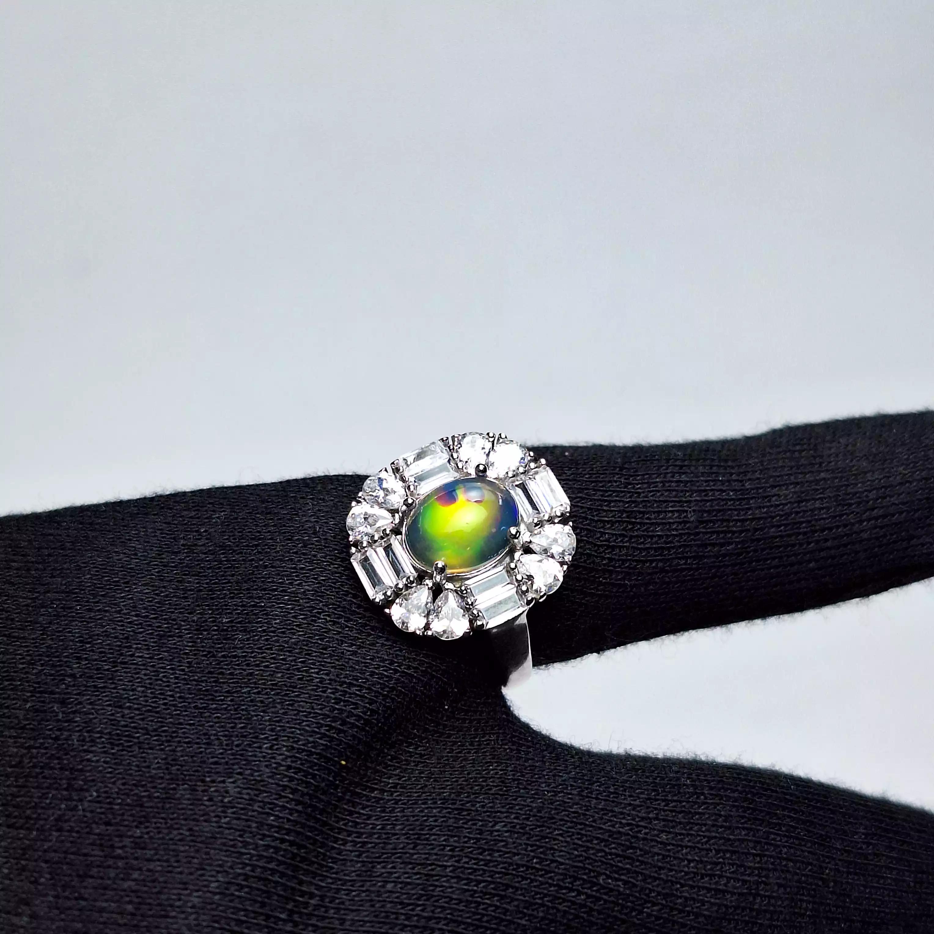 انگشتر زنانه بسیار شیک با طرح رکاب خاص و نگینِ مجذوب کننده اپال است گوهر ارزشمند به کار رفته در این کاملا طبیعی و معدنی بوده که از معادن کشور اتیوپی استخراج شده و همچنین تراش آن تراشی بی نقص است که زیباییاش را دوچندان کرده است بازی رنگ ها و موج های رنگی که از این طرف به آن طرف گوهر حرکت میکنند واقعا مجذوب کننده است. همچنین جنس رکاب از نقره 925 همراه با نگین های مخراجی بوده و با نهایت ظرافت ساخته شده است. در مورد سایز انگشتر اصلا نگران نباشید سایز انگشتر سایز متوسط میباشد و اگر برای انگشت شما بزرگ یا کوچک باشد در نقره فروشی ها، طلافروشی ها، جواهر فروشی ها یا تعمیرات نقره شهرتان با هزینه ناچیزی قابل تغییر سایز است. انگشتر به همراه جعبه چوبی تقدیمتان میشود.