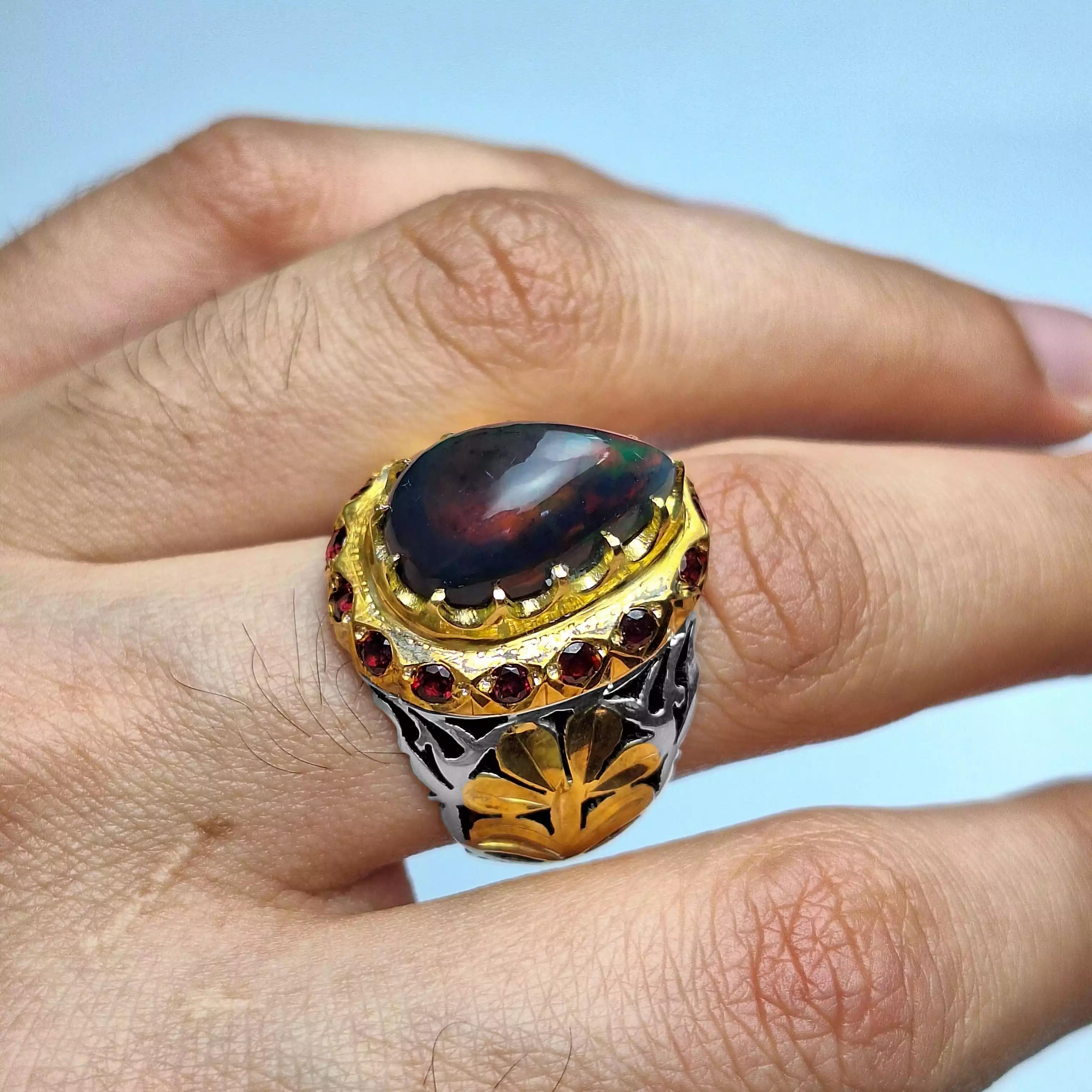 انگشتر مردانه بسیار شیک با طرح رکاب خاص و نگینِ مجذوب کننده اُپال اتیوپی گوهر ارزشمند به کار رفته در این انگشتر کاملا طبیعی و معدنی بوده و همچنین تراش آن تراشی خاص و کمیاب به فرم اشک و همچنین تراشی بی نقص است که زیباییاش را دوچندان کرده! ویژگی اصلی این نگین بازی موج های نورهای رنگی داخل نگین است! رکاب این انگشتر نیز به تنهایی یک اثر فاخر و همه چی تمام میباشد. جنس رکاب از نقره ۹۲۵ یعنی بالاترین عیار مورد استفاده در ساخت جواهرات است که به دست اساتید هنرمند شبکه کاری و سپس آینه شده و با طلا آبکاری شده و سپس با ۱۴ نگین گارنت سرخ طبیعی مخراج کاری شده است. در مورد سایز انگشتر اصلا نگران نباشید سایز انگشتر سایز متوسط میباشد و اگر برای انگشت شما بزرگ یا کوچک باشد در نقره فروشی ها، طلافروشی ها، جواهر فروشی ها یا تعمیرات نقره شهرتان با هزینه ناچیزی قابل تغییر سایز است. انگشتر همراه با جعبه چوبی تقدیمتان میشود.