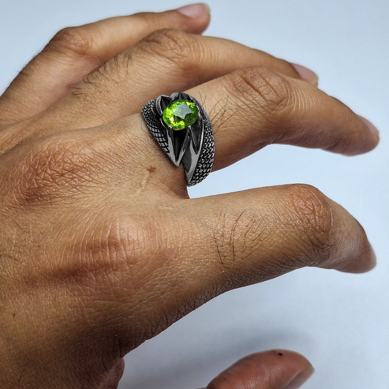 انگشتر مردانه بسیار شیک با طرح رکاب خاص و نگینِ خوش رنگ و خوش تراش زبرجد است گوهر به کار رفته در این انگشتر کاملا طبیعی و معدنی میباشد که از معادن آفریقا استخراج شده و همچنین تراش آن تراشی بی نقص است که زیباییاش را دوچندان کرده و واقعا مجذوب کننده است. همچنین جنس رکاب از نقره 925 یعنی بالاترین عیار مورد استفاده در ساخت جواهرات است که با نهایت دقت و ظرافت ساخته شده است. همچنین در مورد سایز انگشتر اصلا نگران نباشید. سایز انگشتر سایز متوسط میباشد و اگر برای انگشت شما بزرگ یا کوچک باشد در نقره فروشی ها، طلافروشی ها، جواهر فروشی ها یا تعمیرات نقره شهرتان با هزینه ناچیزی قابل سایز شدن است. انگشتر به همراه جعبه چوبی تقدیم میشود.