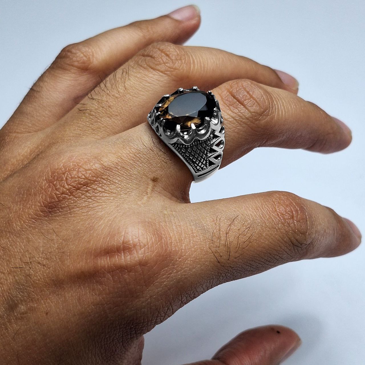 انگشتر مردانه بسیار شیک با طرح رکاب خاص و نگینِ ارزشمند کوارتز دودی! گوهر ارزشمند به کار رفته در این انگشتر کاملا طبیعی و معدنیست و همچنین تراش آن تراشی بینقص است که زیباییاش را دو چندان کرده است! جنس رکاب از نقره 925 یعنی بالاترین عیار مورد استفاده در ساخت جواهرات است. در مورد سایز انگشتر اصلا نگران نباشید سایز انگشتر سایز متوسط میباشد و اگر برای انگشت شما بزرگ یا کوچک باشد در نقره فروشی ها، طلافروشی ها، جواهر فروشی ها یا تعمیرات نقره شهرتان با هزینه ناچیزی قابل تغییر سایز است. همراه با جعبه چوبی تقدیم می شود.
