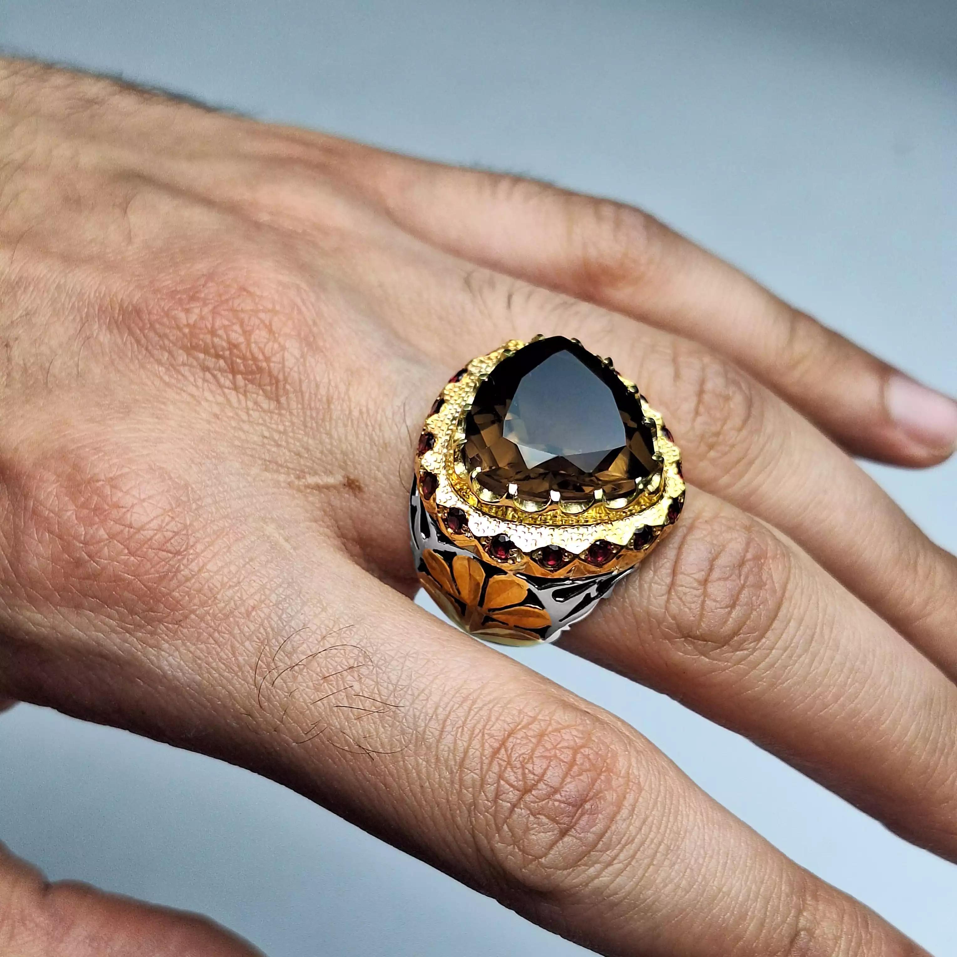 انگشتر مردانه بسیار شیک با طرح رکاب خاص و پرکار و نگینِ مجذوب کننده کوارتز دودی گوهر ارزشمند به کار رفته در این کاملا طبیعی و معدنی بوده و همچنین تراش آن تراشی خاص و بی نقص است که زیباییاش را دوچندان کرده! همچنین جنس رکاب از نقره ۹۲۵ به دست اساتید هنرمند با ظرافت و زیبایی ساخته شده و به معنای واقعی هر هنری که میتوان روی یک انگشتر برای همه چیز تمام شدن آن انجام داد انجام شده است که شامل شبکه کاری، آینه کاری، آبکاری طلا و مخراج کاری با ۱۷ عدد نگین گارنت سرخ طبیعی است. در مورد سایز انگشتر اصلا نگران نباشید سایز انگشتر سایز متوسط میباشد و اگر برای انگشت شما بزرگ یا کوچک باشد در نقره فروشی ها، طلافروشی ها، جواهر فروشی ها یا تعمیرات نقره شهرتان با هزینه ناچیزی قابل تغییر سایز است. انگشتر همراه با جعبه چوبی تقدیمتان میشود.