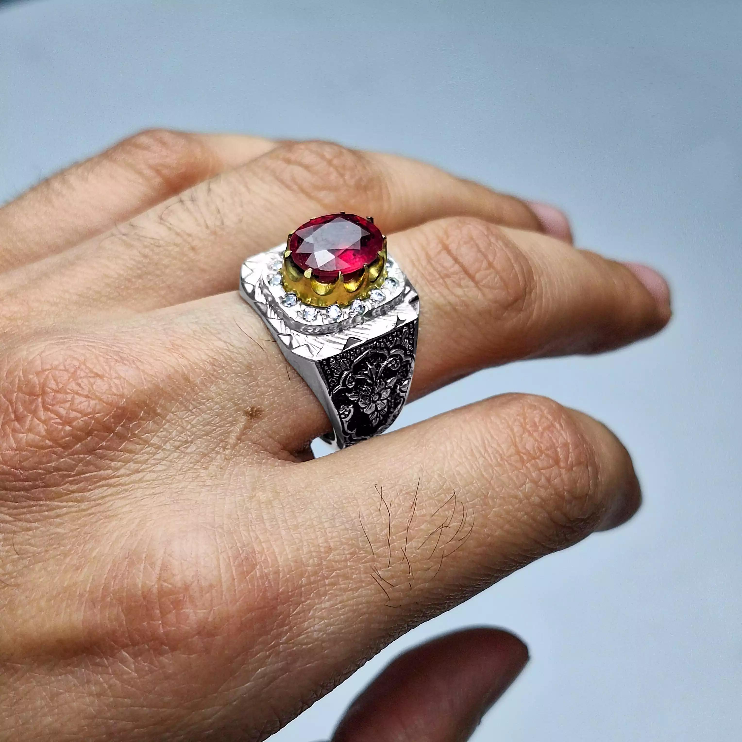 انگشتر مردانه بسیار شیک با طرح ركاب پركار و نگين ارزشمند و خوش تراش ياقوت سرخ گوهر به کار رفته در این انگشتر کاملا طبیعی و معدنیست و همچنین تراش آن تراشی بی نقص است که زیباییاش را دوچندان کرده است. همچنین جنس رکاب از نقره ۹۲۵ است كه با نهایت دقت و ظرافت به دست اساتيد هنرمند ساخته و سپس قلمزني و و با نگين هاي برليانكات مخراج كاري شده است. همچنین در مورد سایز انگشتر اصلا نگران نباشید. سایز انگشتر سایز متوسط میباشد و اگر برای انگشت شما بزرگ یا کوچک باشد در نقره فروشی ها، طلافروشی ها، جواهر فروشی ها یا تعمیرات نقره شهرتان با هزینه ناچیزی قابل سایز شدن است. انگشتر همراه با جعبه چوبی تقدیمتان میشود.