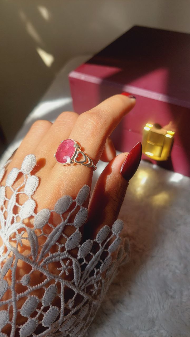 انگشتر نقره زنانه با نگین یاقوت سرخ است انگشتر زنانه شیک با رکاب طرح قلبی با نگینِ خوش رنگ و خوش تراش یاقوت سرخ