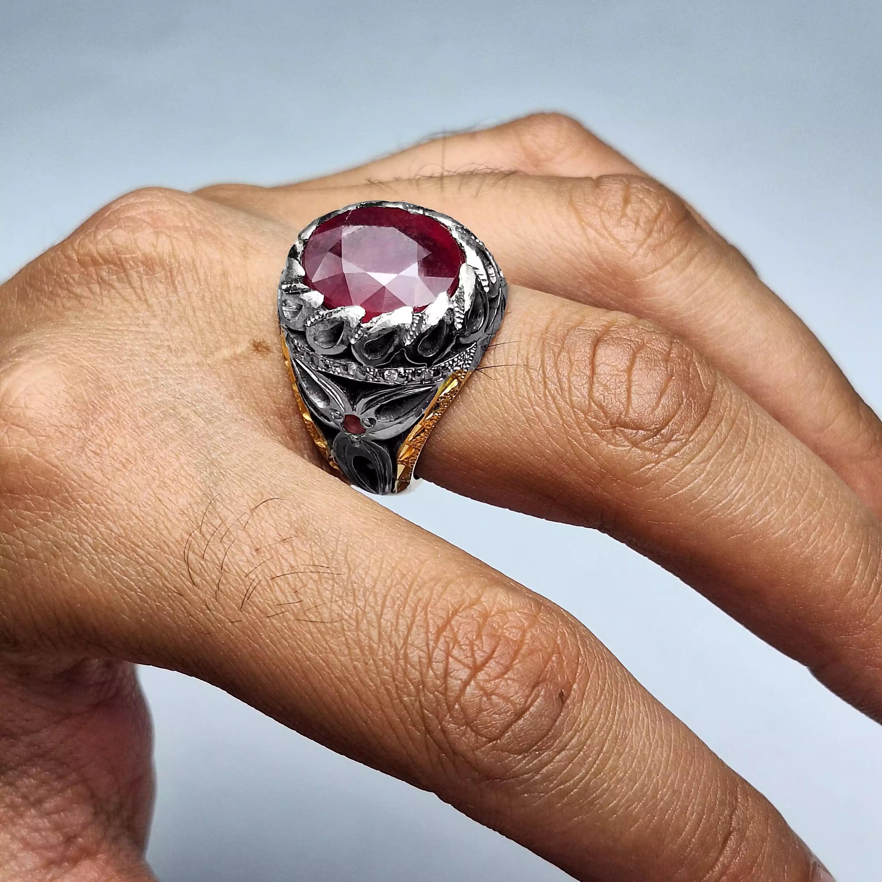 انگشتر مردانه بسیار شیک با طرح رکاب پرکارِ گل سهپر و بته جقه و نگینِ مجذوب کننده و ارزشمند یاقوت سرخ گوهر ارزشمند به کار رفته در این انگشتر کاملا طبیعی و معدنیست که از آفریقا استخراج شده است و همچنین تراش آن تراشی بینقص است که زیباییاش را دو چندان کرده است! همچنین جنس رکاب از نقره 925 یعنی بالاترین عیار مورد استفاده در ساخت جواهرات است که به دست اساتید هنرمند ساخته شده و سپس شبکه کاری، آینه کاری، مخراج کاری و با طلا و رادیوم آبکاری شده است. در مورد سایز انگشتر اصلا نگران نباشید سایز انگشتر سایز متوسط میباشد و اگر برای انگشت شما بزرگ یا کوچک باشد در نقره فروشی ها، طلافروشی ها، جواهر فروشی ها یا تعمیرات نقره شهرتان با هزینه ناچیزی قابل تغییر سایز است. انگشتر همراه با جعبه چوبی تقدیمتان میشود.