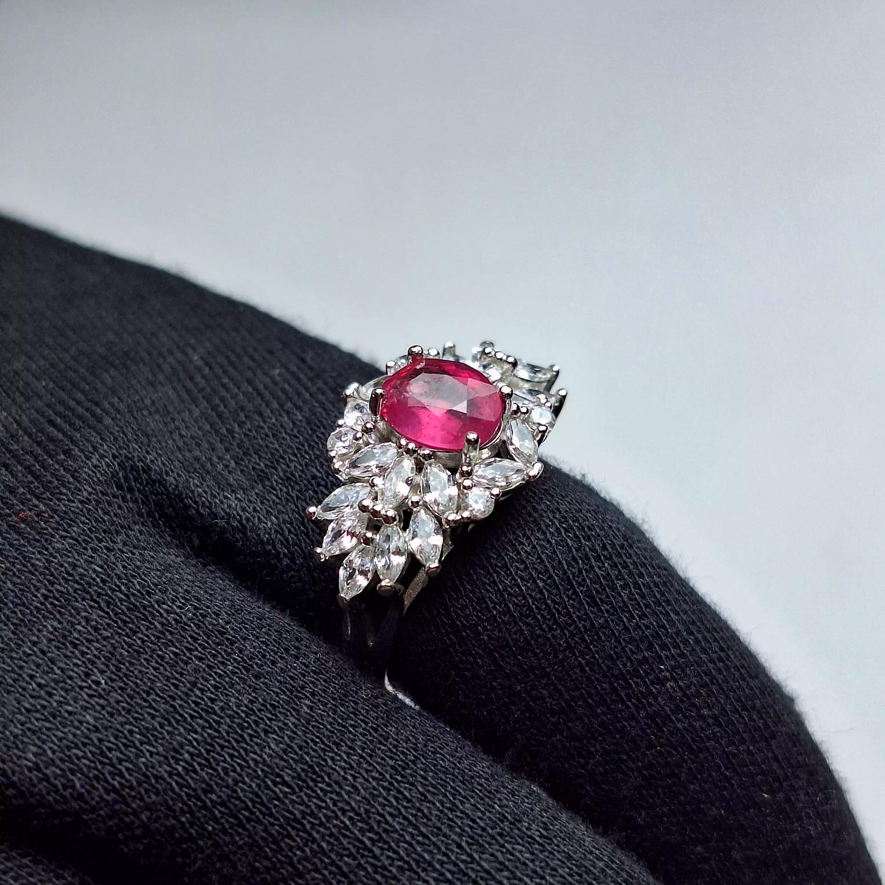 انگشتر زنانه بسیار شیک با طرح رکاب خاص و نگینِ خوش رنگ و خوش تراش یاقوت سرخ است گوهر به کار رفته در این انگشتر کاملا طبیعی و معدنی می‌باشد و همچنین تراش آن تراشی بی نقص است که این موضوع زیبایی‌اش را دوچندان کرده و واقعا مجذوب کننده‌ است. همچنین جنس رکاب از نقره 925 به همراه نگین های کوچک اتمی است و با نهایت دقت و ظرافت ساخته شده است. همچنین در مورد سایز انگشتر اصلا نگران نباشید. سایز انگشتر سایز متوسط می‌باشد و اگر برای انگشت شما بزرگ یا کوچک باشد در نقره فروشی ها، طلافروشی ها، جواهر فروشی ها یا تعمیرات نقره شهرتان با هزینه ناچیزی قابل سایز شدن است. انگشتر به همراه جعبه چوبی تقدیمتان میشود.