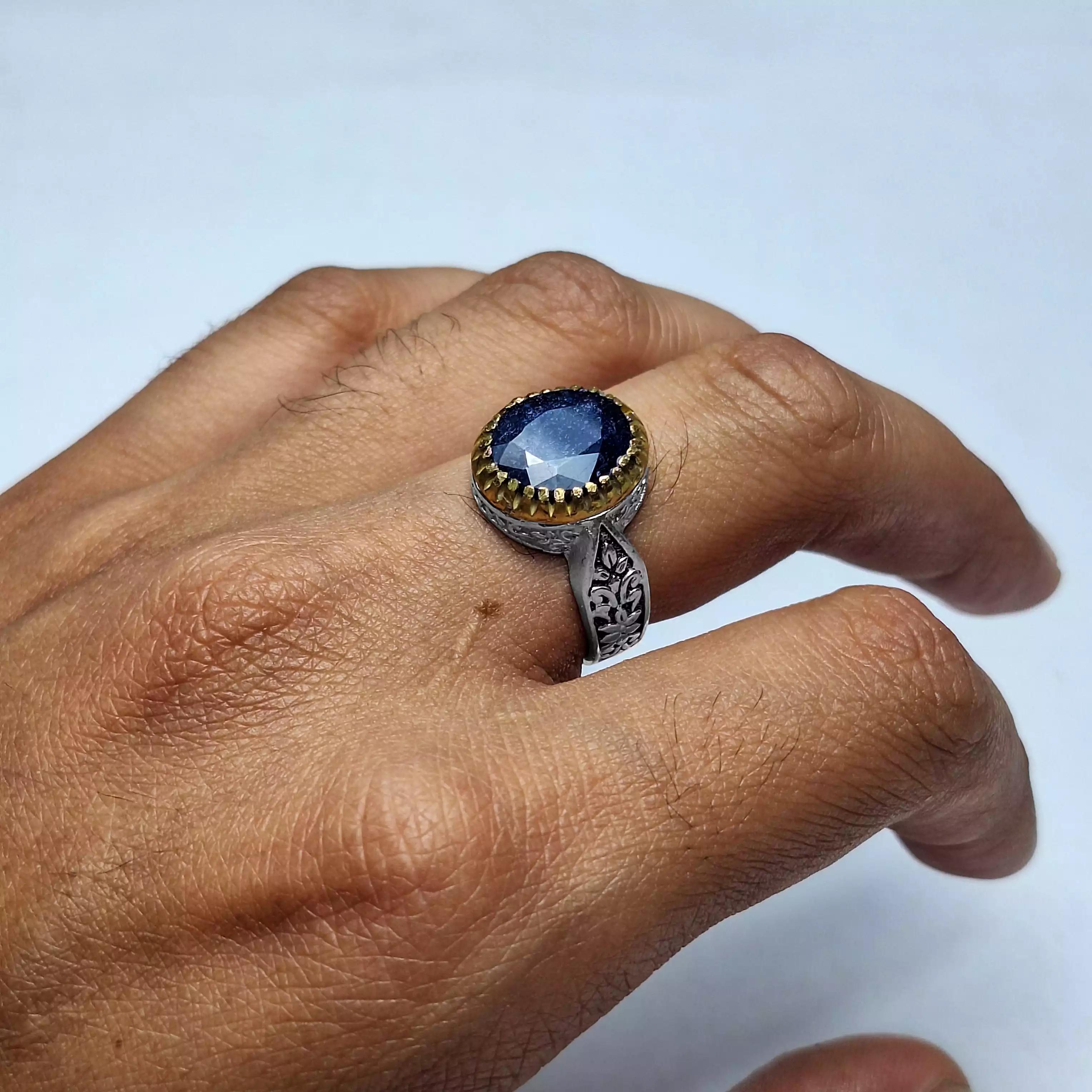 انگشتر مردانه بسیار شیک با طرح رکاب خاص و نگین مجذوب کننده یاقوت کبود گوهر ارزشمند به کار رفته در این انگشتر کاملا طبیعی و معدنی است که از معادن آفریقا استخراج شده و همچنین تراش آن تراشی بینقص است که زیباییاش را دو چندان کرده است همچنین جنس رکاب از نقره 925 یعنی بالاترین عیار مورد استفاده در ساخت جواهرات است. در مورد سایز انگشتر اصلا نگران نباشید سایز انگشتر سایز متوسط میباشد و اگر برای انگشت شما بزرگ یا کوچک باشد در نقره فروشی ها، طلافروشی ها، جواهر فروشی ها یا تعمیرات نقره شهرتان با هزینه ناچیزی قابل تغییر سایز است. انگشتر همراه با جعبه چوبی تقدیمتان میشود.
