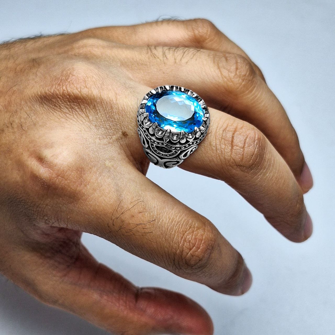 انگشتر مردانه بسیار شیک با طرح رکاب خاص و نگینِ ارزشمند توپاز سوئیس است! گوهر ارزشمند به کار رفته در این انگشتر کاملا طبیعی و معدنیست و همچنین تراش آن تراشی بینقص است که زیباییاش را دو چندان کرده است! جنس رکاب از نقره 925 یعنی بالاترین عیار مورد استفاده در ساخت جواهرات است که با نهایت دقت و ظرافت ساخته شده است. در مورد سایز انگشتر اصلا نگران نباشید سایز انگشتر سایز متوسط میباشد و اگر برای انگشت شما بزرگ یا کوچک باشد در نقره فروشی ها، طلافروشی ها، جواهر فروشی ها یا تعمیرات نقره شهرتان با هزینه ناچیزی قابل تغییر سایز است. به همراه جعبه چوبی تقدیم میشود.