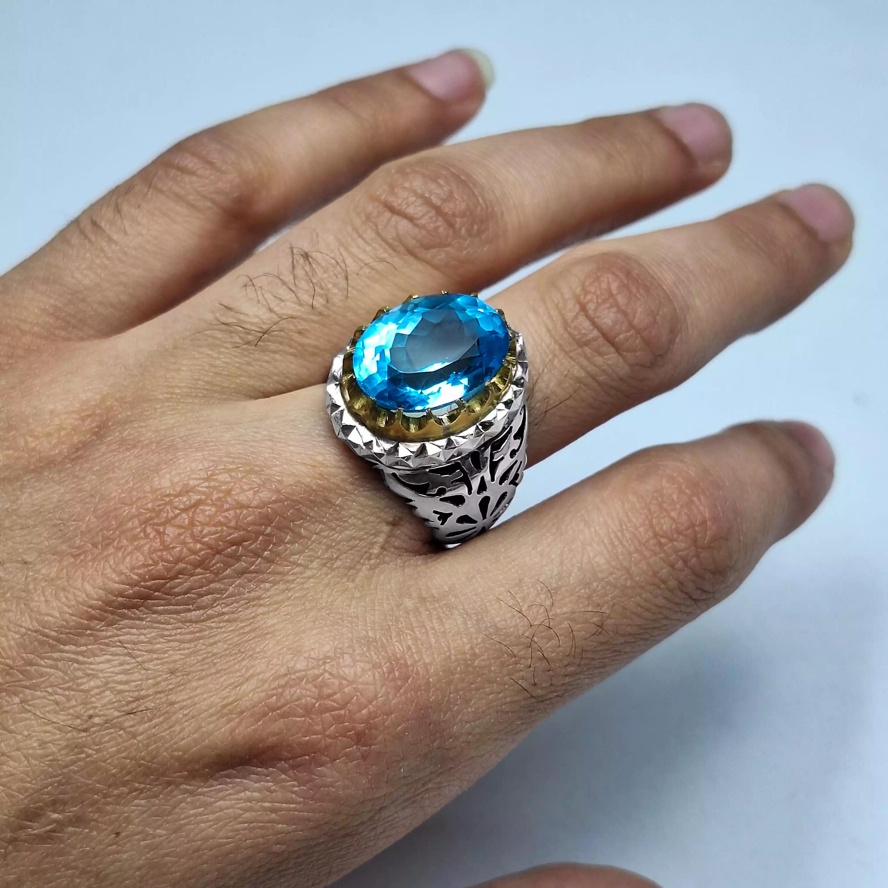 انگشتر مردانه بسیار شیک با طرح رکاب خاص و نگینِ ارزشمند توپاز سوئیس گوهر به کار رفته در این انگشتر کاملا طبیعی و معدنیست و همچنین تراش آن تراشی بی نقص است که این موضوع زیباییاش را دوچندان کرده و واقعا مجذوب کننده است. همچنین جنس رکاب بالاترین عیار نقره مورد استفاده در ساخت جواهرات یعنی نقره 925 است که با نهایت دقت و ظرافت ساخته شده است. همچنین در مورد سایز انگشتر اصلا نگران نباشید. سایز انگشتر سایز متوسط میباشد و اگر برای انگشت شما بزرگ یا کوچک باشد در نقره فروشی ها، طلافروشی ها، جواهر فروشی ها یا تعمیرات نقره قابل تغییر سایز است. انگشتر به همراه جعبه چوبی به شما تقدیم میشود.